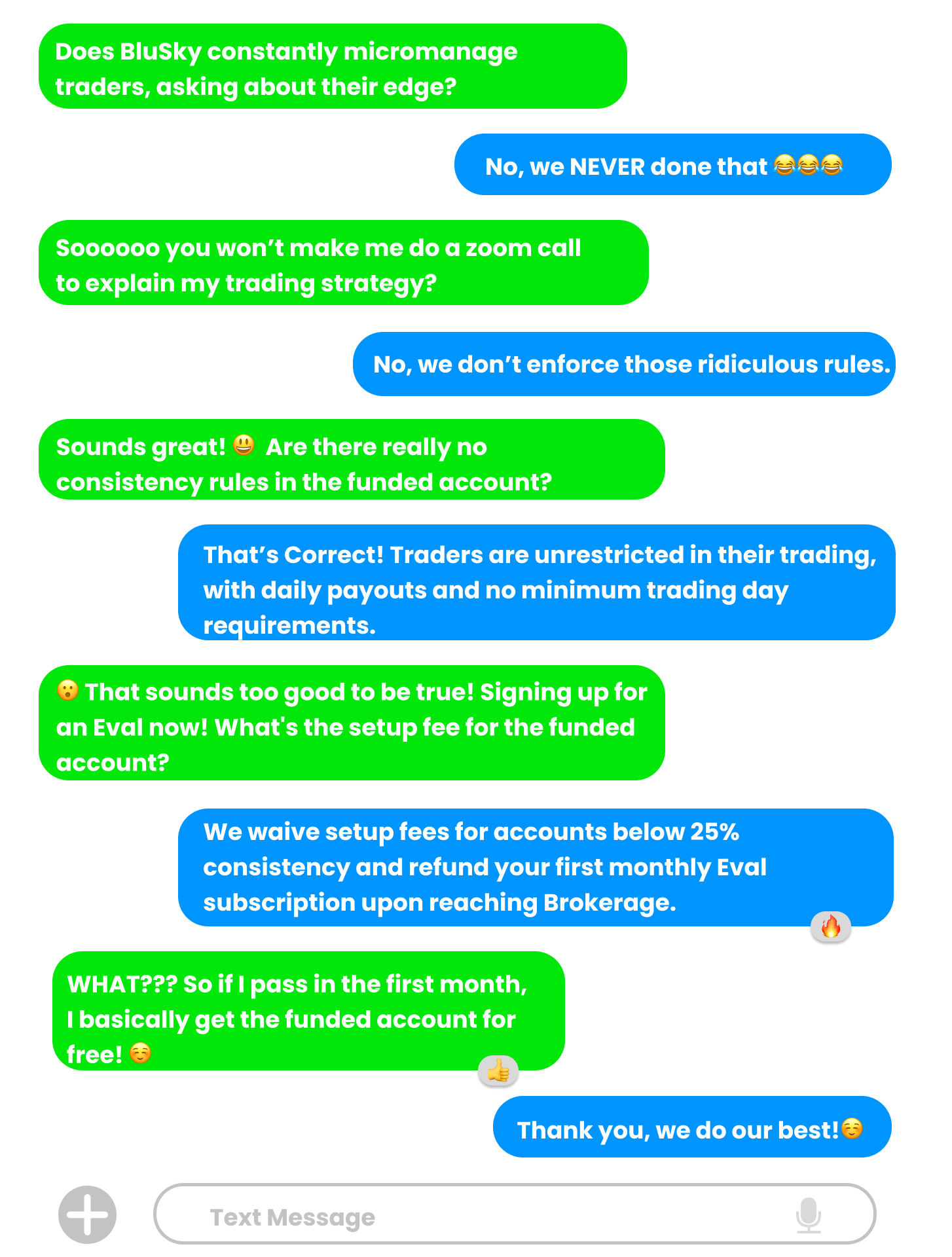 We've noticed a significant number of traders who are accustomed to the rules set by other Prop-firms. To assist you and highlight how BluSky differs, we've gathered a series of questions we've been receiving from you and turned it into a chat with our support.
