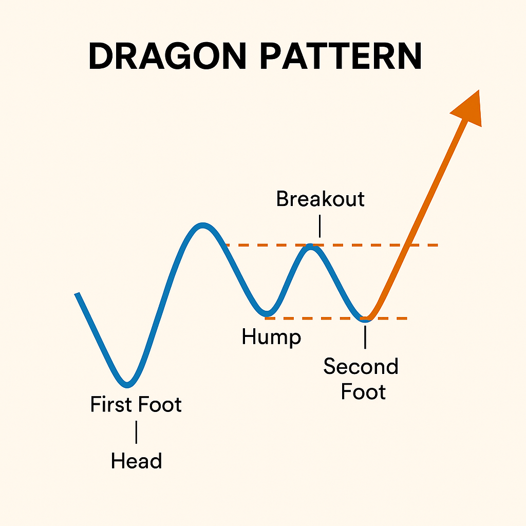 The dragon pattern is a type of bullish reversal pattern. It shows up after a downtrend and signals that buyers are stepping back in. The name comes from the shape it forms on a chart—it looks like a crouching Chinese dragon.